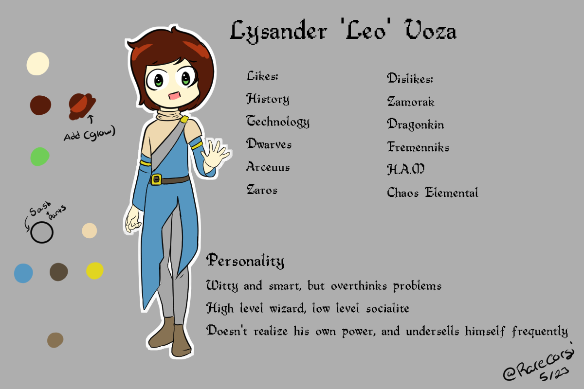 Leo was a prodigy baby. He was adept in the ways of magicks, and was trained by not only Runescape’s top wizards, but ultimately his mother, as she had Icyene blood in her. Her blood, now born into her child, held a similar power. Although it’s been a very well kept secret from him, she’s told him that he’d always had a knack for magic, and that he should pursue his interest in such arts. Once he was old enough to travel the world, she bestowed unto him ancient robes that had been ‘in the family’ for generations, and a weapon to go with it; a set of ancestral robes, and a Kodai wand. As much as she loves her son, she’s torn on his fate. Will he forever stay ignorant of his ties, and live out his life as a happy human, or will he eventually see who he really is, and take the mantle of burden of being half Icyene?