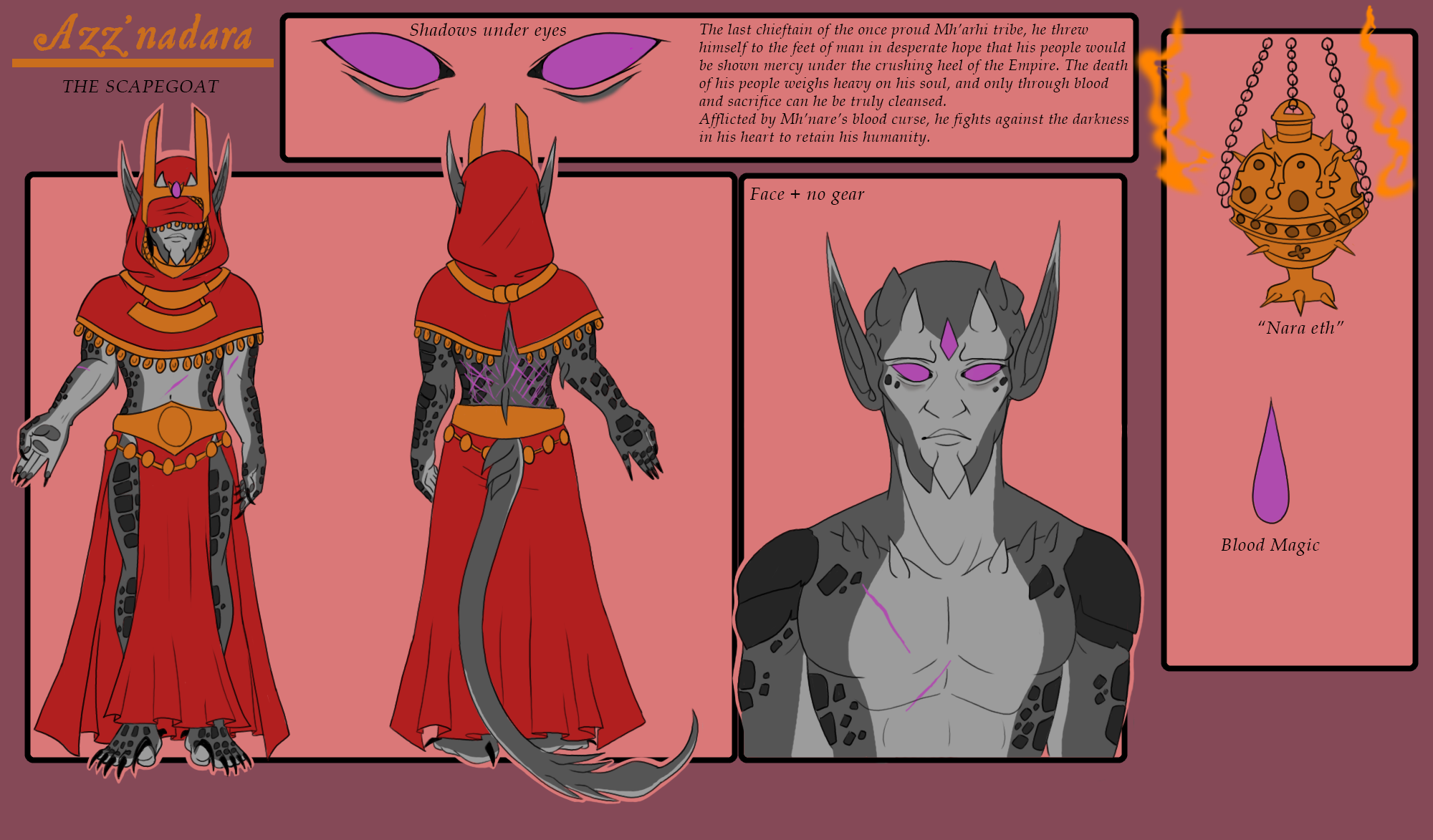 When the Empire assimilated the Mar into its fold by force, Azzy did not wish to fight. Too many had been killed. Seen as beasts to be controlled, the Mar were treated with cruelty in the capital. Seeing the death and destruction around him, the proud people beaten into submission, he offered himself as sacrifice. He lay before the church, offering his body as the sacrificial lamb so that no other Mar may be harmed. The priests accepted this offer and did as such, only then realizing the power of Mar blood and the magic it contained. They extended a hand and offered him a seat among them. Believing that with his power he would hold some sway over religious politics and could offer his people more support with the church’s aid, he accepted. What he didn’t realize is that he was simply a pawn to the Pontifices and was opening the door for his people to be subjected to the horrors of the Weeping One. The road to hell is paved with good intentions after all… can he be saved?